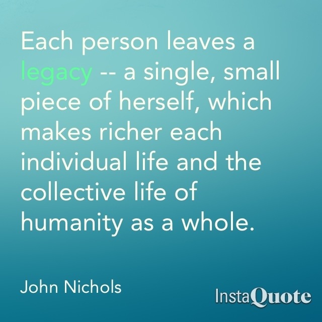 Leaving behind a legacy can be simple. You don’t have to succeed at ensuring world peace, or single handily solving world issues. Nor do you have to possess something tangible of great value to pass on to your descendants. You can leave a legacy simply by being a good friend or example. You never know who is watching you, or who you will inspire with your actions. To imprint your legacy upon others, merely live life to its fullest, take advantage of opportunities, and watch how you change lives one positive action at a time.
